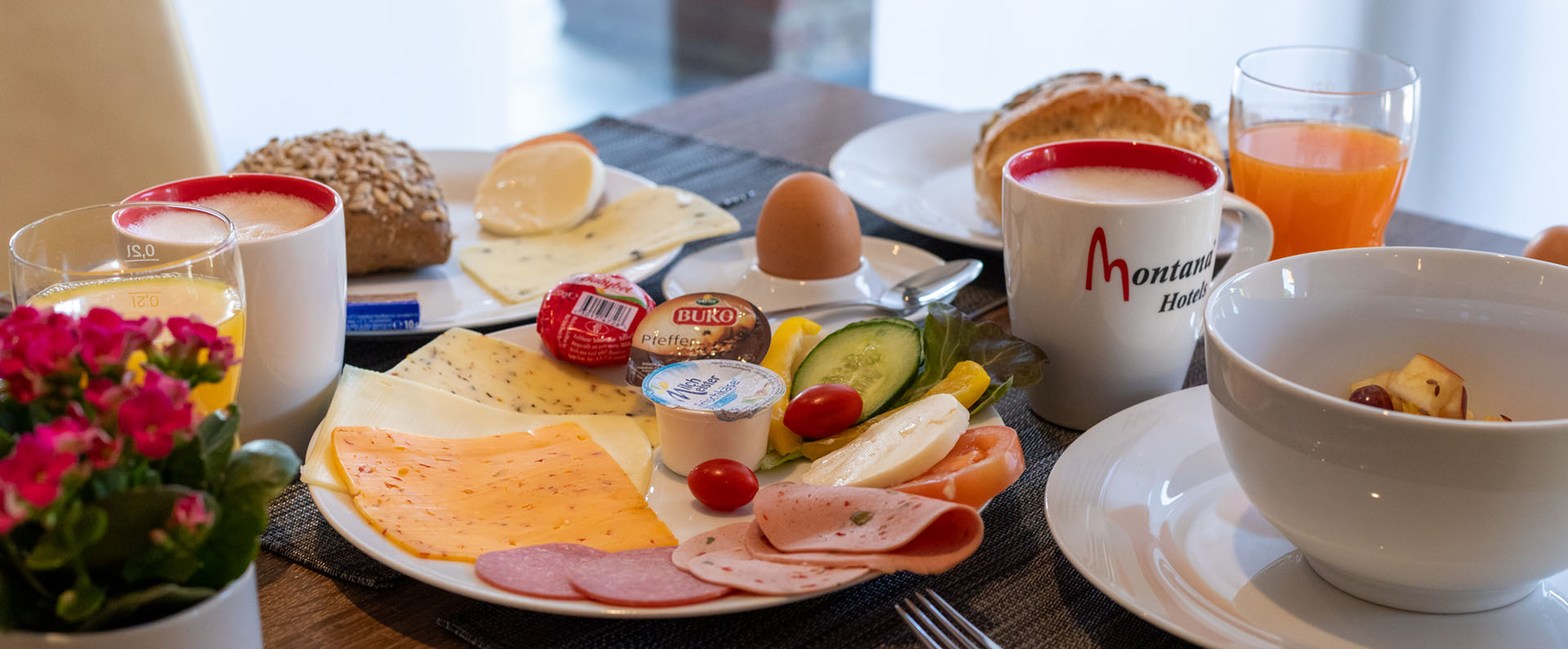 Für den guten Start in den Tag bieten wir Ihnen eine reichhaltige Auswahl an frischem Brot und Brötchen, Kaffeespezialitäten, Tee und verschiedenen Säften.
